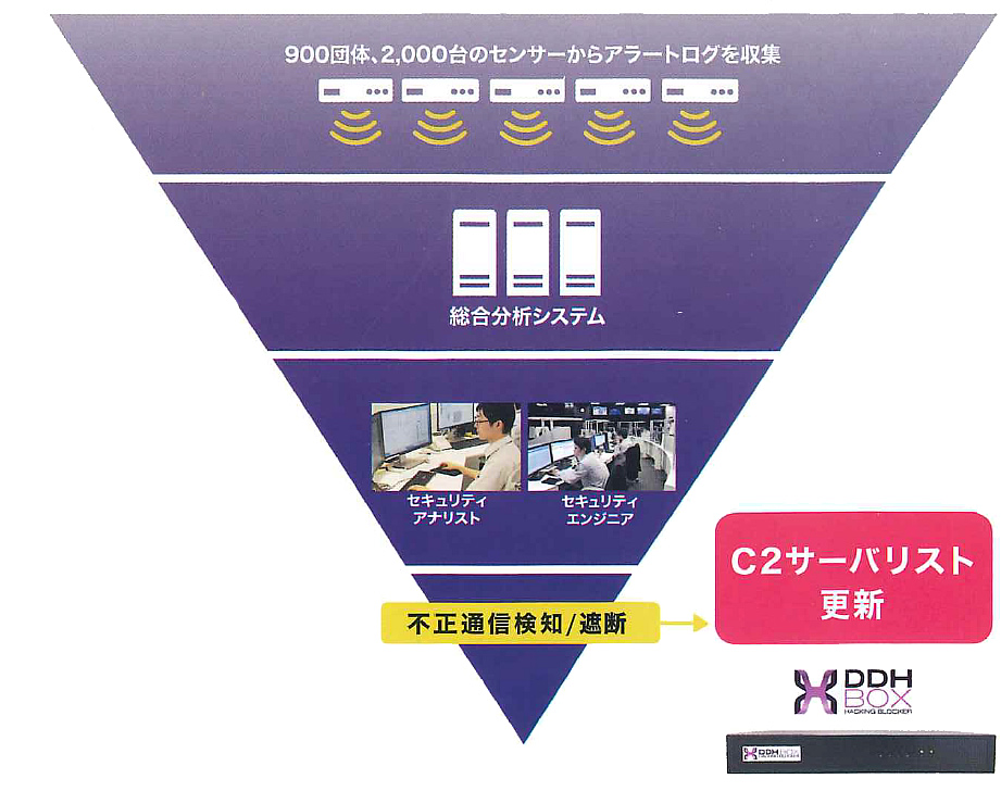 DDHBOXに搭載されたC2サーバリストは、国内トップセキュリテイベンダである株式会社ラックの協力によって実現した「日本で実際に検出された不正なサーバ(C2サーバを含む)」の最新情報を集約したブラックリストです。不正なサーバの情報及びブラックリストは365日毎日更新されるため、常に最新の脅威情報に対応し続けることが可能です。