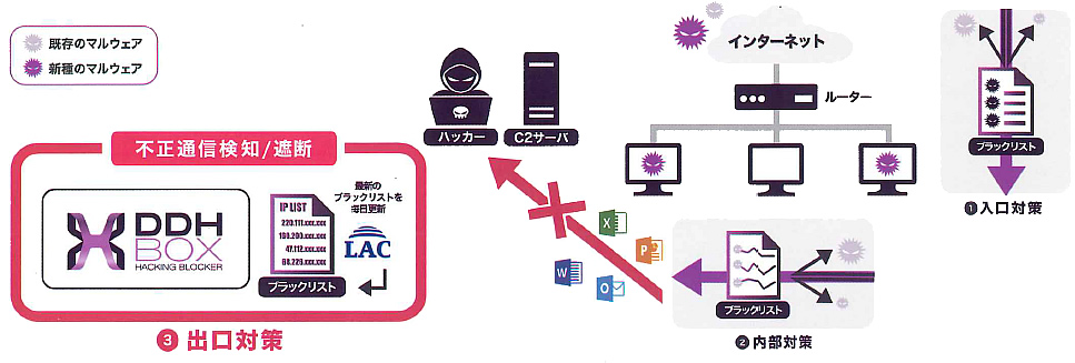 | 出口対策 | ハッカーが使用するC2サーバのブラックリストにて不正通信を検知して遮断。 | ハッカーが情報窃取に使用するC2サーバの最新通信先をリスト化しておき、その通信先のアクセスが発生した際に検知·遮断。 |